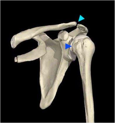 The bony anatomy of the shoulder begins with the upper arm (humerus), the collar bone (clavicle) and the shoulder blade (scapula). The main shoulder joint is a ball-and-socket joint formed between the humerus and the scapula (darker blue arrow). This ball-and socket construction gives the shoulder joint great mobility. The acromio-clavicular joint ("A-C") joint is formed where the collar bone and shoulder blade meet (light blue arrow).
