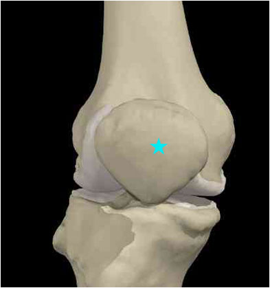 The kneecap (patella) (star) lives in the front of the knee joint. As the knee flexes and extends, the kneecap glides up and down in a cartilage-lined groove in the end of the thighbone.