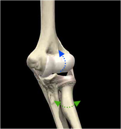 A fancy hinge joint that can not only swing back and forth (flex and extend—blue arrow), but also swivel, the elbow allows the forearm and hand to rotate into the palm-down position (pronation) and the palm-up position (supination) (green arrow). All these motions come into play during the golf swing.